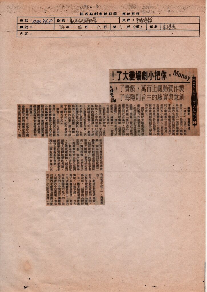 國家劇院實驗劇展每檔戲的製作預算是五十萬元,但這幾年來的作品往往是超出預算,最近下檔的果陀劇團「夢幻迷宮」便超支到近百萬元,而像綠光劇團的歌舞劇「領帶與高跟鞋」、幾年前進行式劇團的「蝴蝶君」,預算也都超出百萬元。